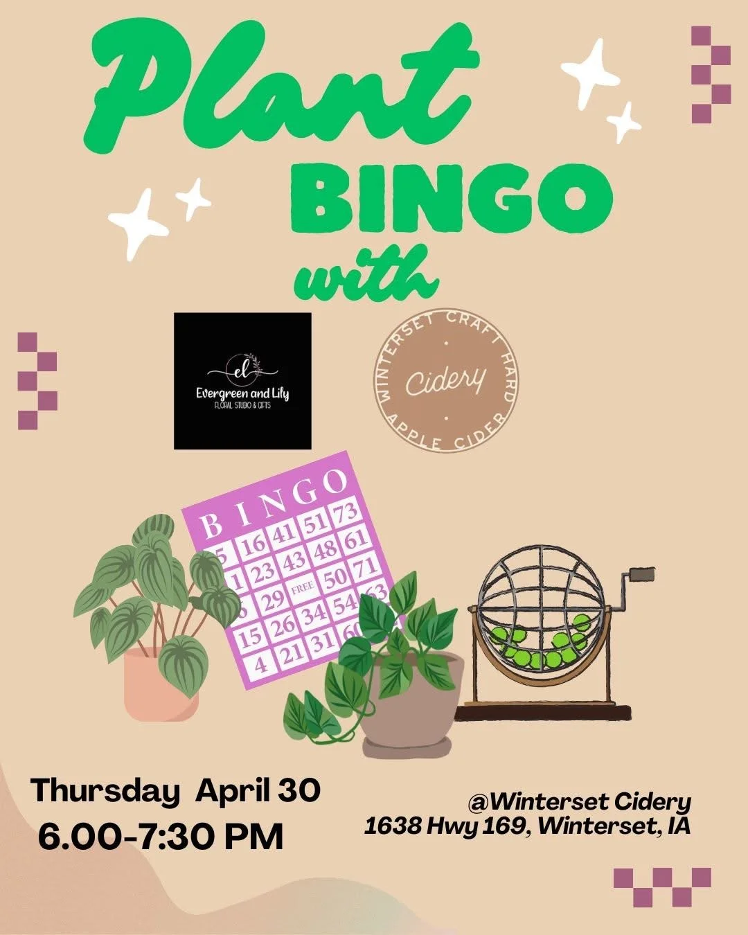 Join Evergreen and Lily Floral Studio with Winterset Cidery for a fun evening of Plant BINGO! Your registration includes: